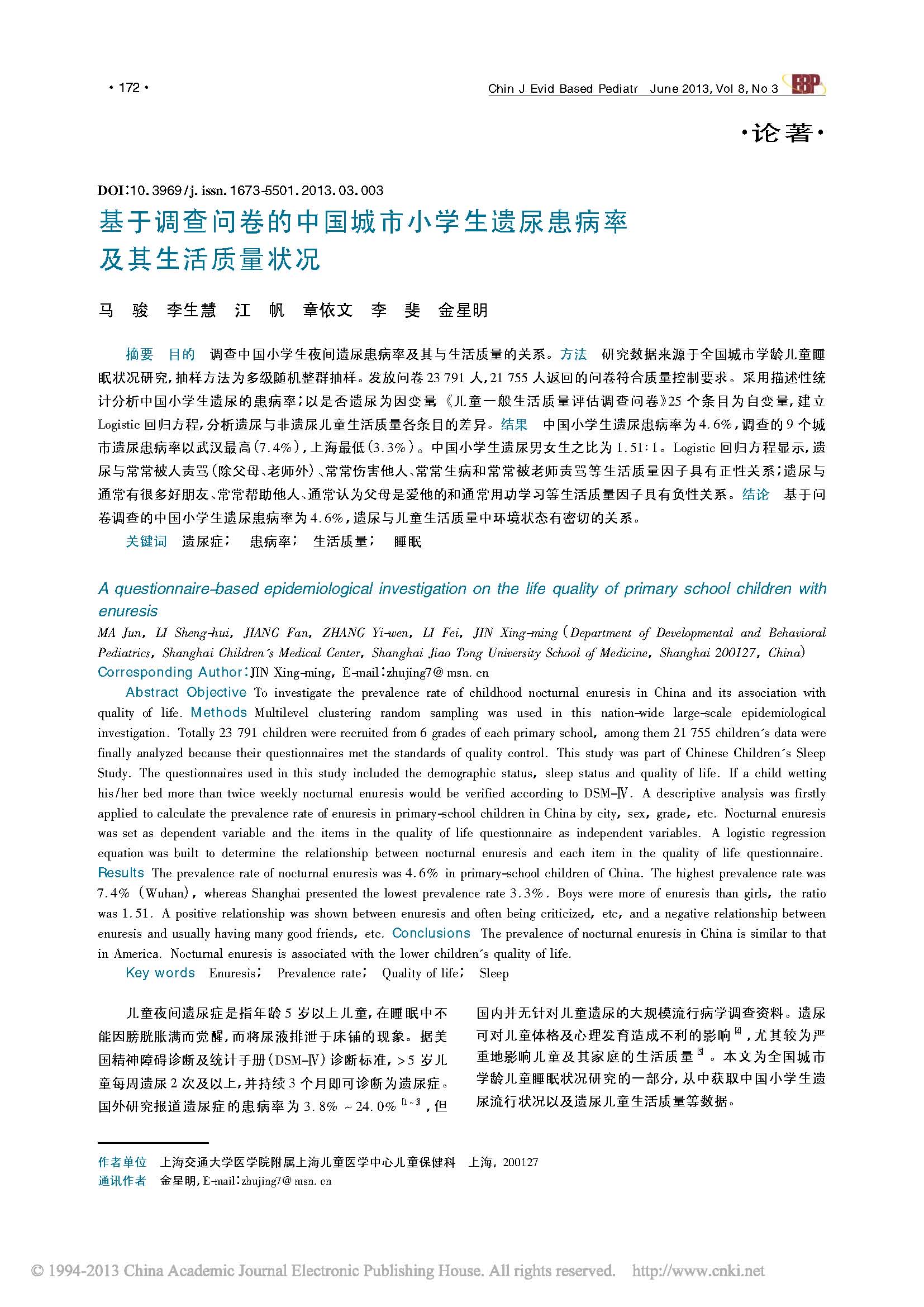 /基于調(diào)查問卷的中國城市小學生遺尿患病率及其生活質(zhì)量狀況_馬駿.pdf